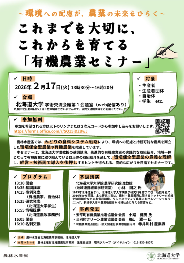 2月17日(火)13時30分より農林水産省北海道農政事務所主催「これまでを大切に、これからを育てる「有機農業セミナー」」が開催されます。北海道大学准教授小林国之先生が講演される他、北海道大学の学生発表もございますので、ご興味がございましたら是非ご参加ください。下記より開催概要となります。